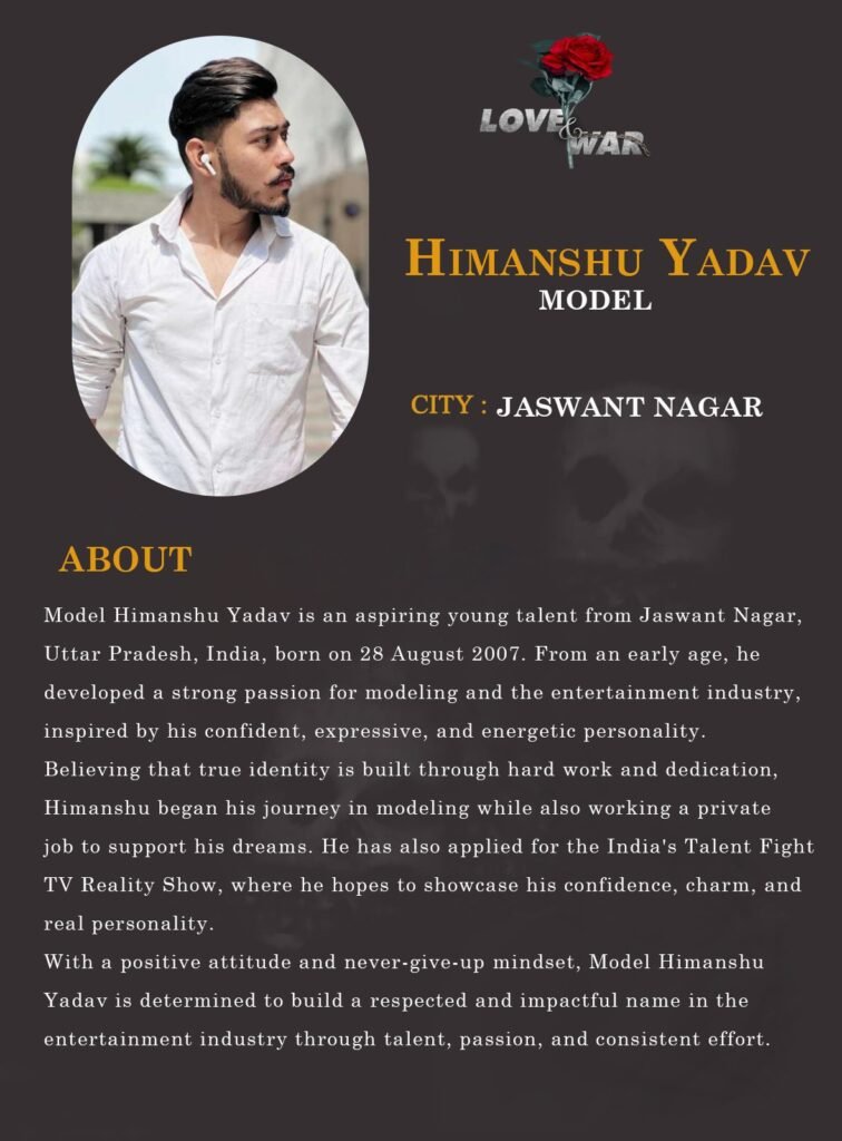 Model Himanshu Yadav is an aspiring young talent from Jaswant Nagar, Uttar Pradesh, India, born on 28 August 2007. From an early age, he developed a strong passion for modeling and the entertainment industry, inspired by his confident, expressive, and energetic personality.