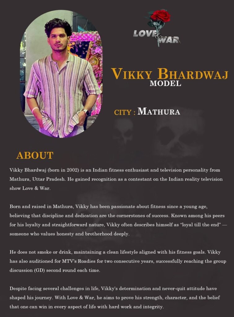 Vikky Bhardwaj (born in 2002) is an Indian fitness enthusiast and television personality from Mathura, Uttar Pradesh. He gained recognition as a contestant on the Indian reality television show Love & War.